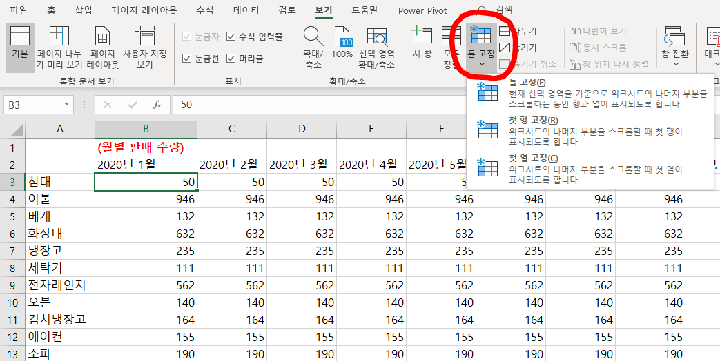 3 ‘보기’의 하위 메뉴 중에서 ‘틀 고정’이라는 기능을 선택합니다.